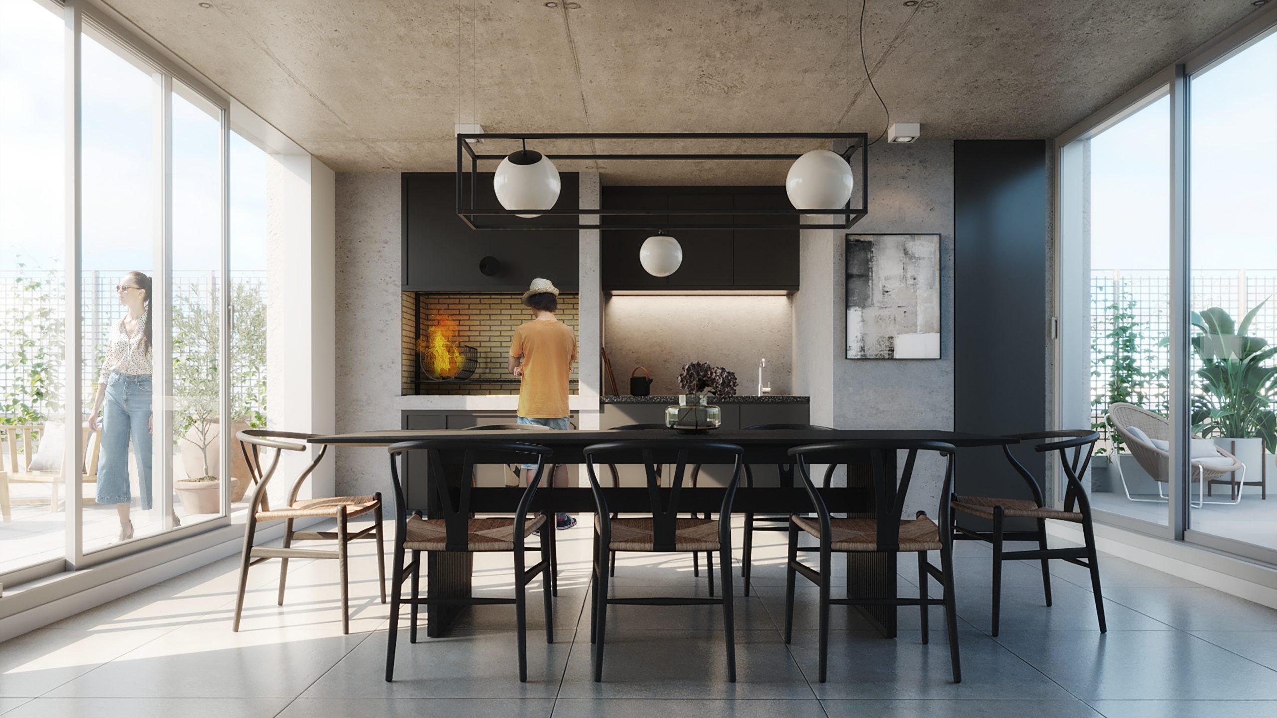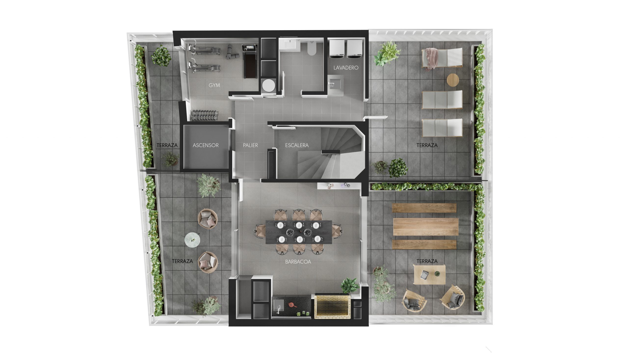 Amenities en el ultimo nivel con barbacoa equipada, parrillero, terrazas al frente y contrafrente, gimnasio y lavadero colectivo equipados.
