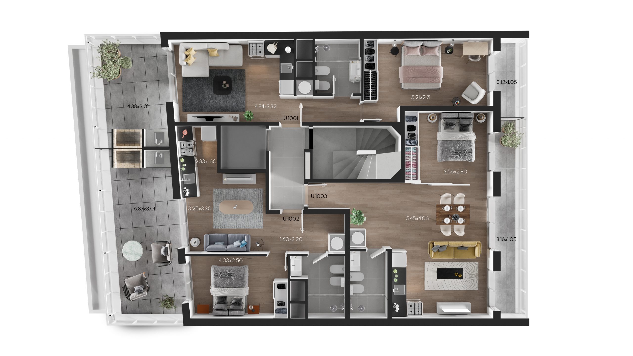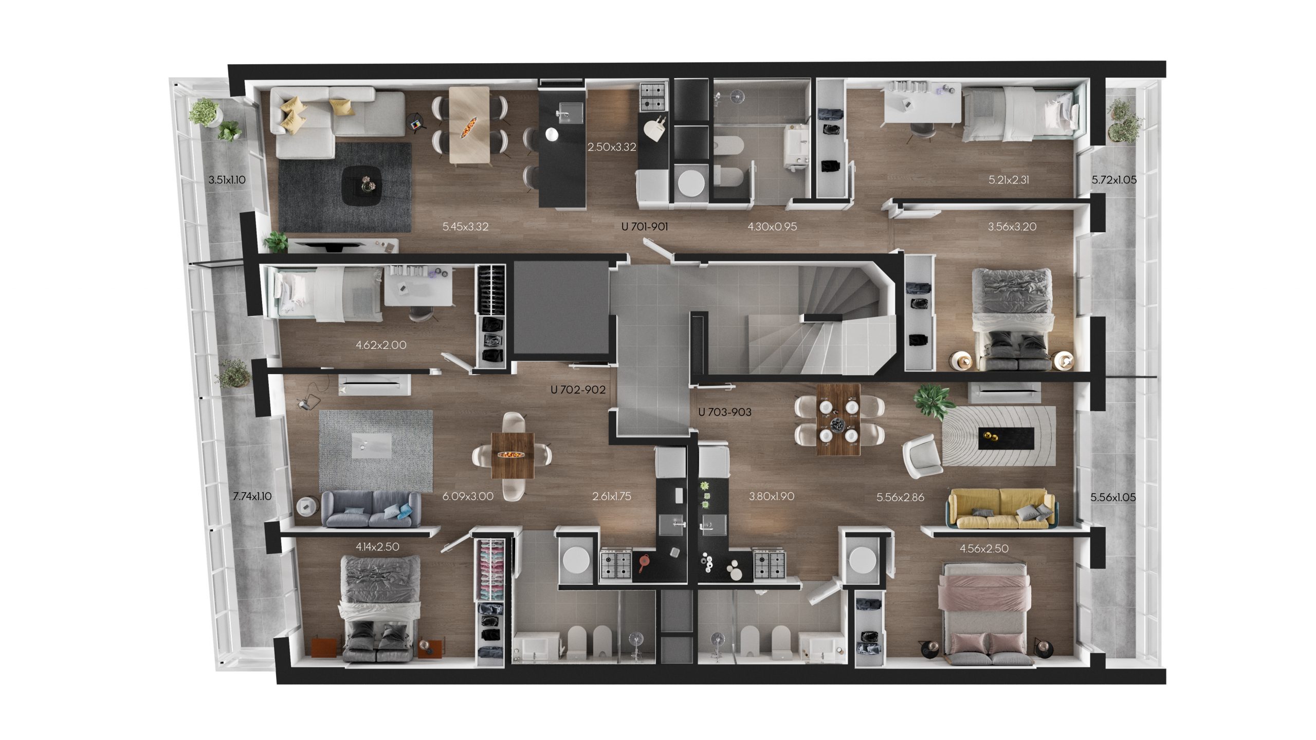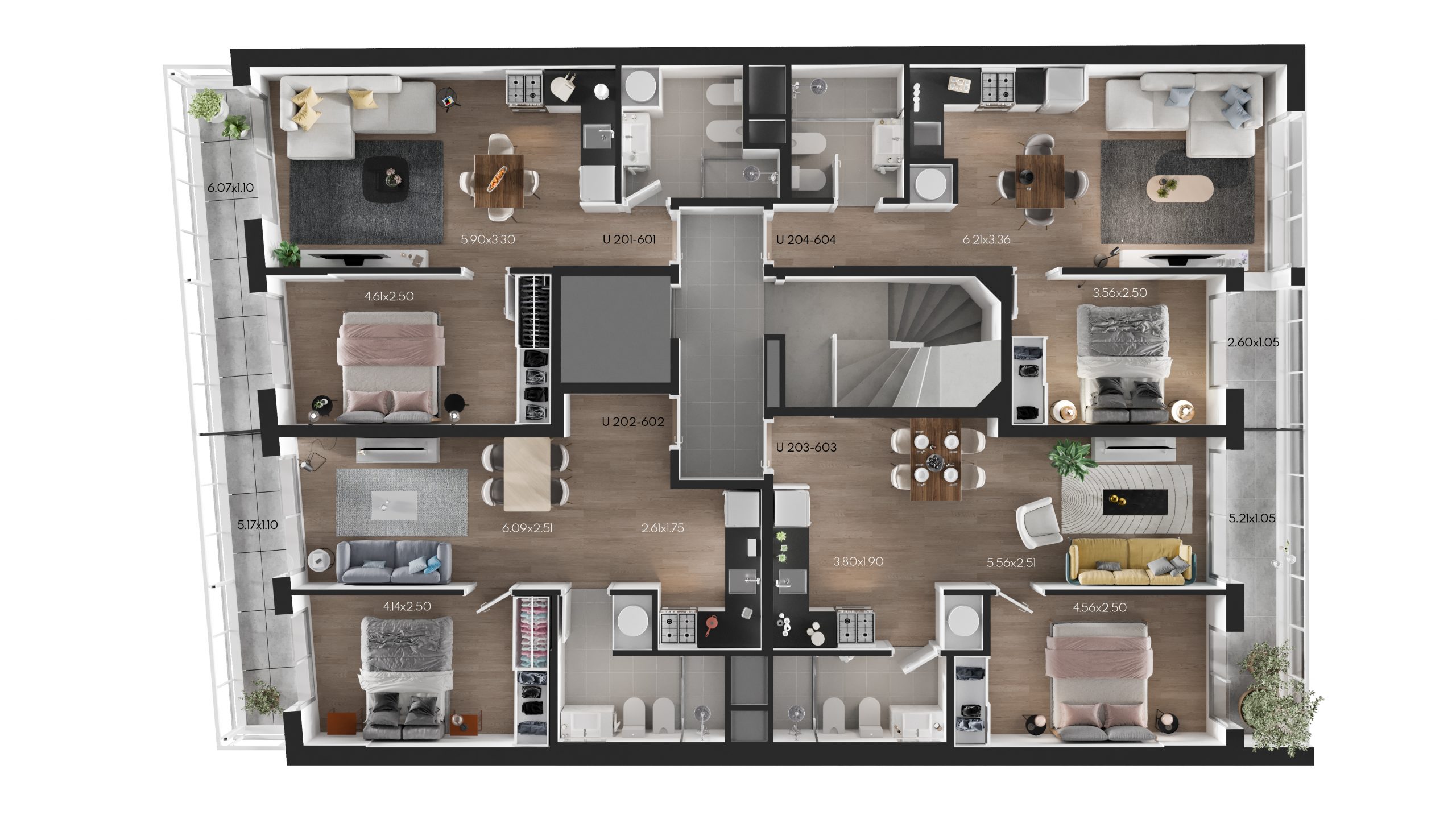 Todas las unidades cuentan con terraza o patio de uso exclusivo. Las viviendas son de tamaño y distribución estándar con aberturas de aluminio anodizado natural y cortinas de enrollar en todos los ambientes. Espacios de living y dormitorios con previsión eléctrica y sanitaria para equipos de aire acondicionado.